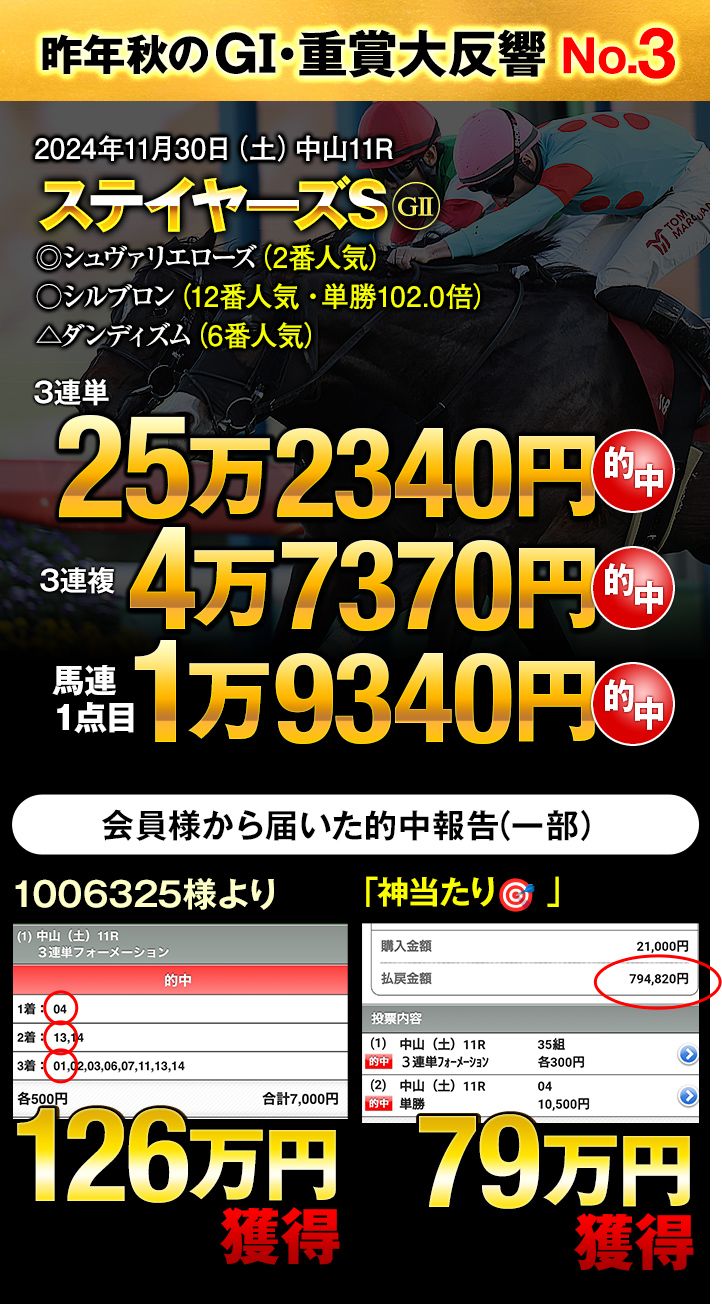 というのは、G1シーズンの勝負情報の中でも基本中の基本であり、昨年秋にはこのような特大万馬券的中もお届けしている。