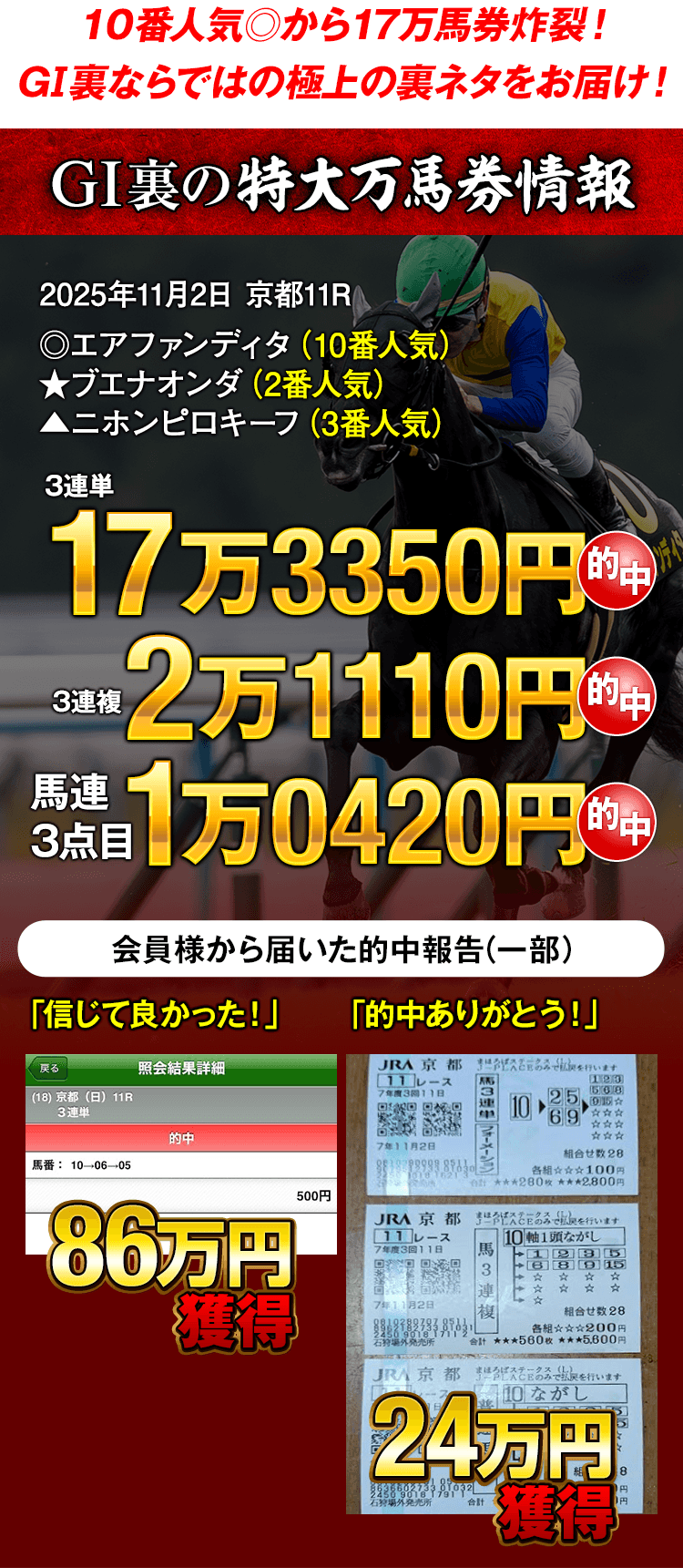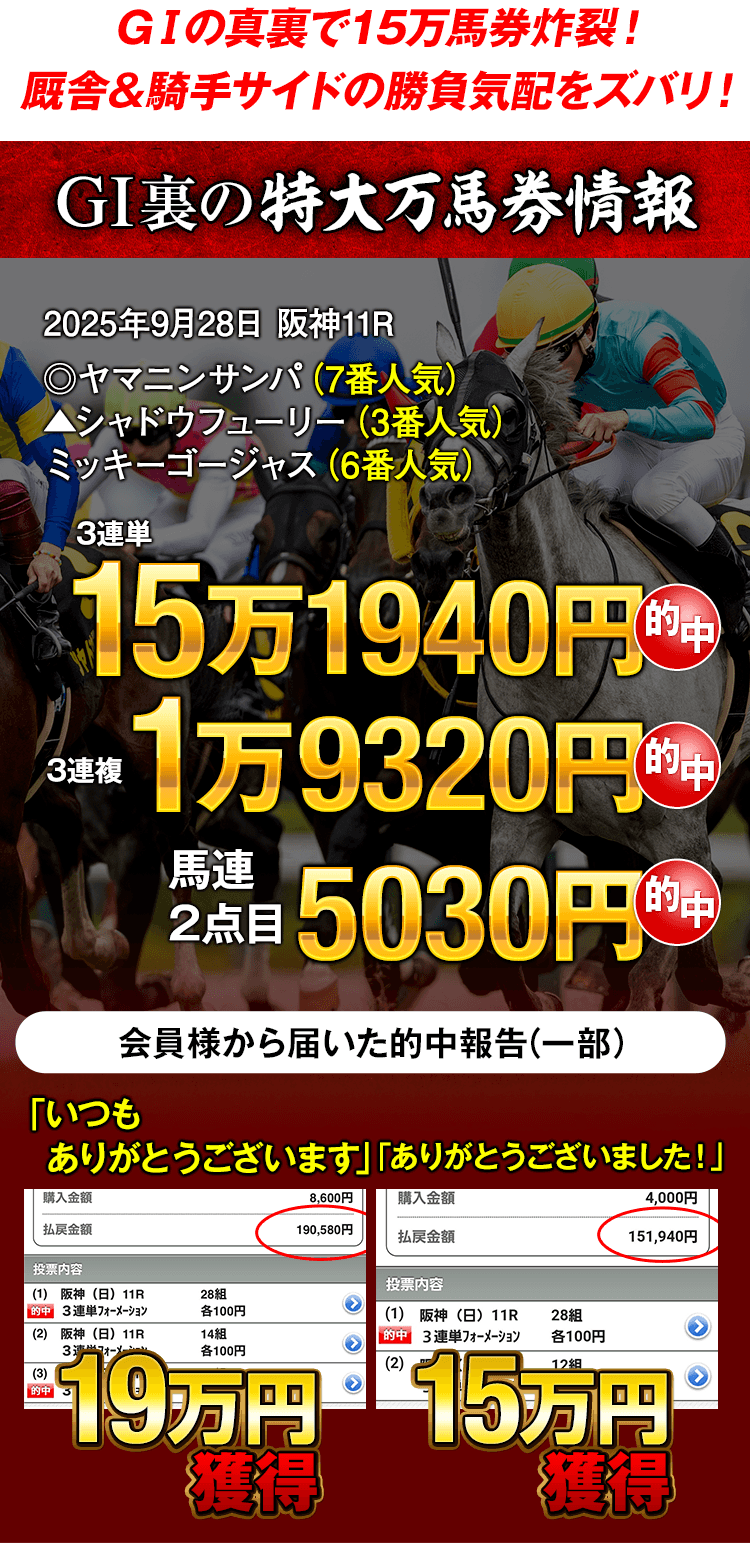 実際に、今秋のGⅠシリーズも、ここまでGⅠの“裏”や谷間で、表向きには出回らない関係者の本音をキッチリと入手し、数々の高配当的中をお届け!
