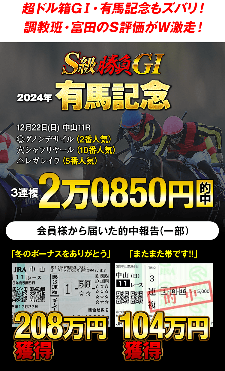 昨年もシンクタンクの超ドル箱GⅠ・有馬記念で、YouTube上でも大活躍の調教班・富田がS評価に挙げていた◎ダノンデサイル(2番人気)&穴シャフリヤール(10番人気)が情報通りに好走を遂げ【3連複2万0850円的中】をお届けし帯封&大金獲得報告が殺到!