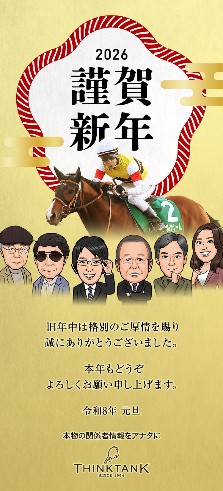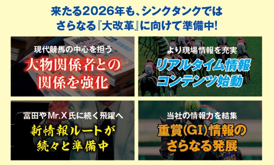 新年もシンクタンクの強みである現場力を磨き、さらに良い勝負馬券をお届けするべく日々精進すると共に、皆様にとってより身近で、より役立つようなサイト作りに取り組んでまいる所存です。